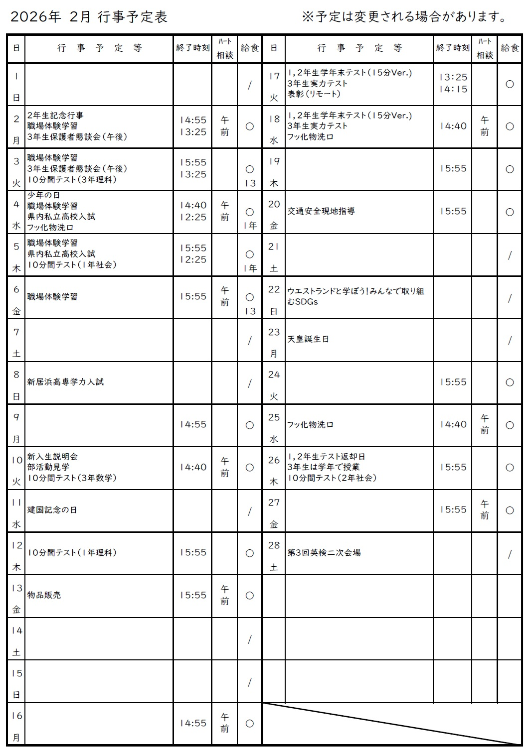 2月行事予定を更新しました。